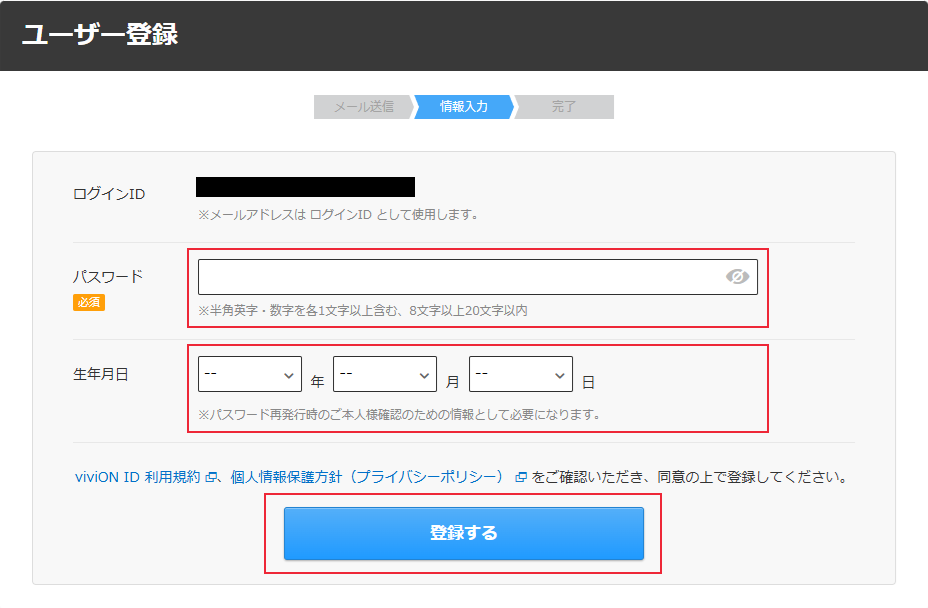 次回以降のログインに必要なパスワードを入力して、[登録する] をクリックします。
