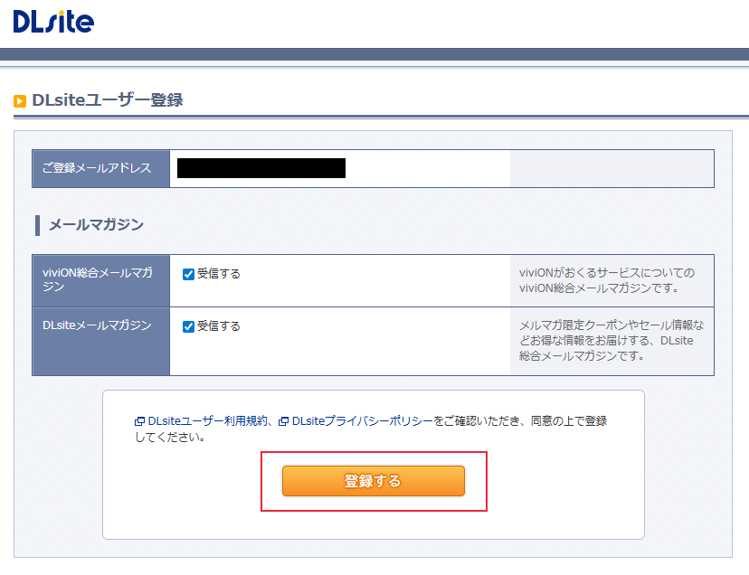 メールマガジンを受信するかを確認の上 [登録する] ボタンをクリックします。